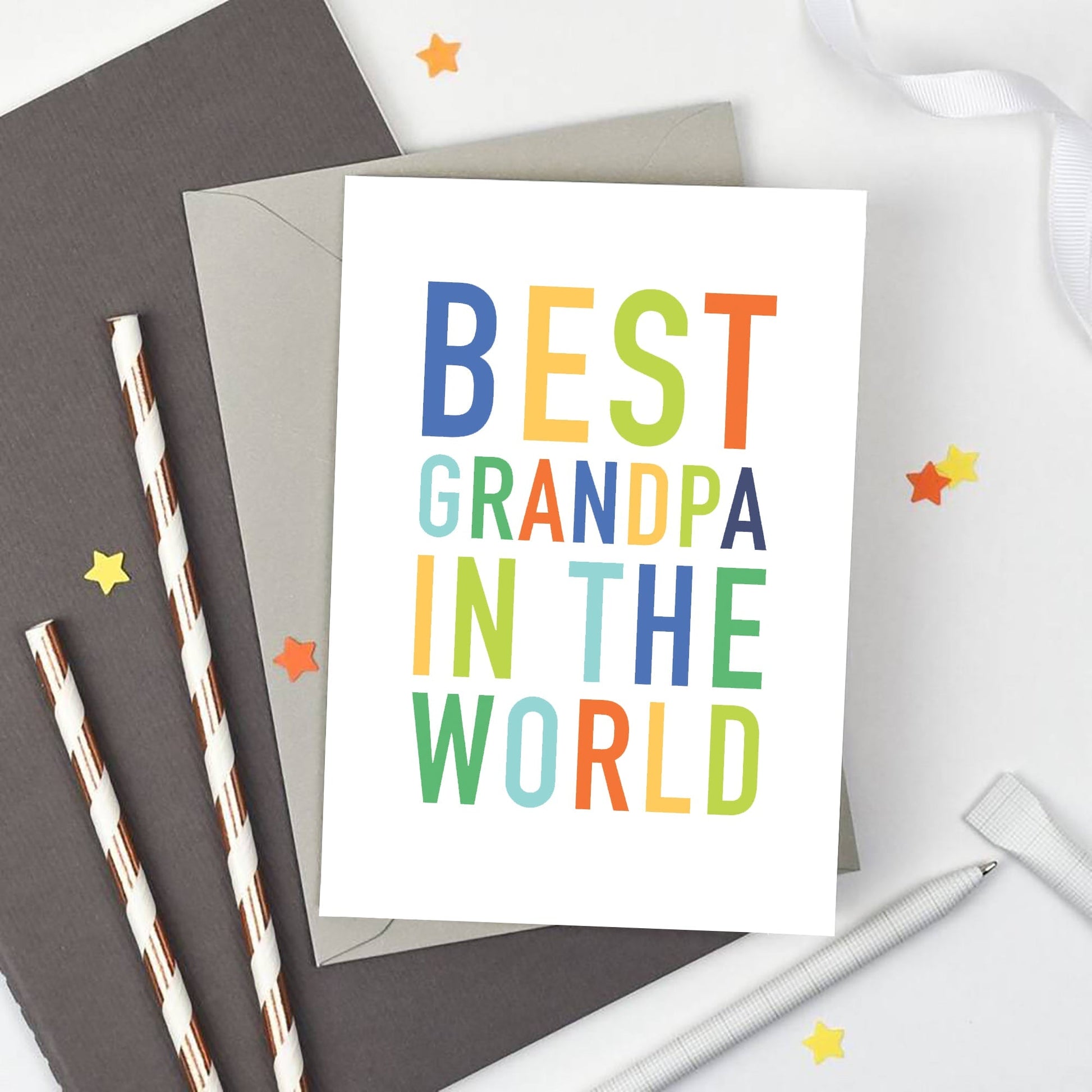 The front of this card is printed with the words best grandpa in the world in a contemporary multi-coloured font.