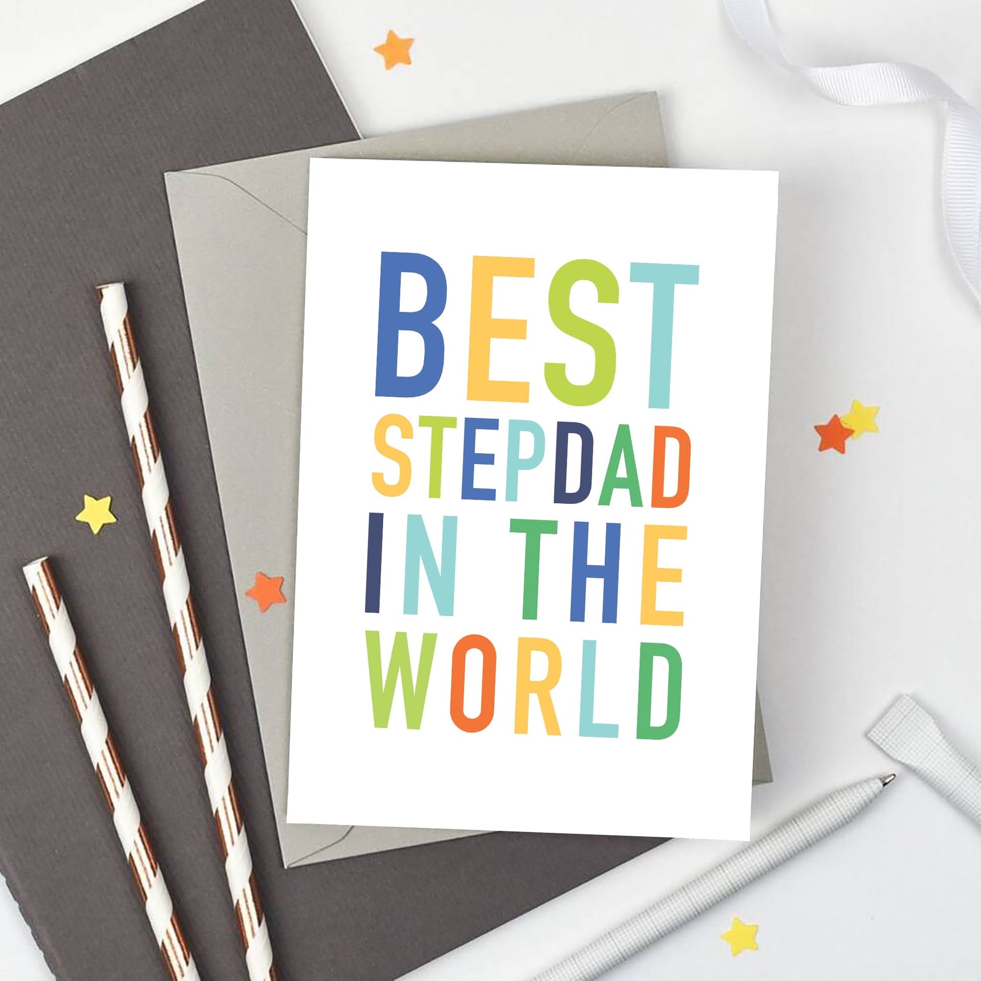 The front of this card is printed with the words best stepdad in the world in a contemporary multi-coloured font.