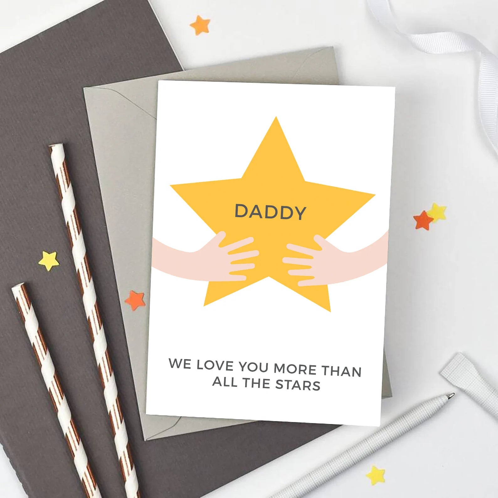 The front of this card has a large yellow star on the front with the word daddy in the centre. Underneath are the words we love you more than all the stars which have been printed in a charcoal grey colour.