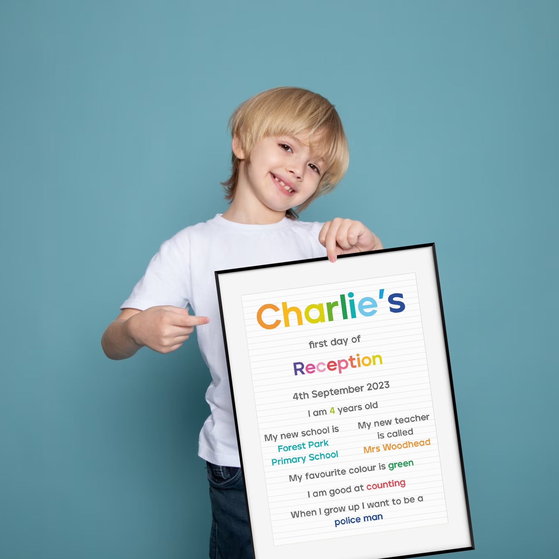 Why not take a photo of them in their new school uniform holding the poster as a special momento of their first day!