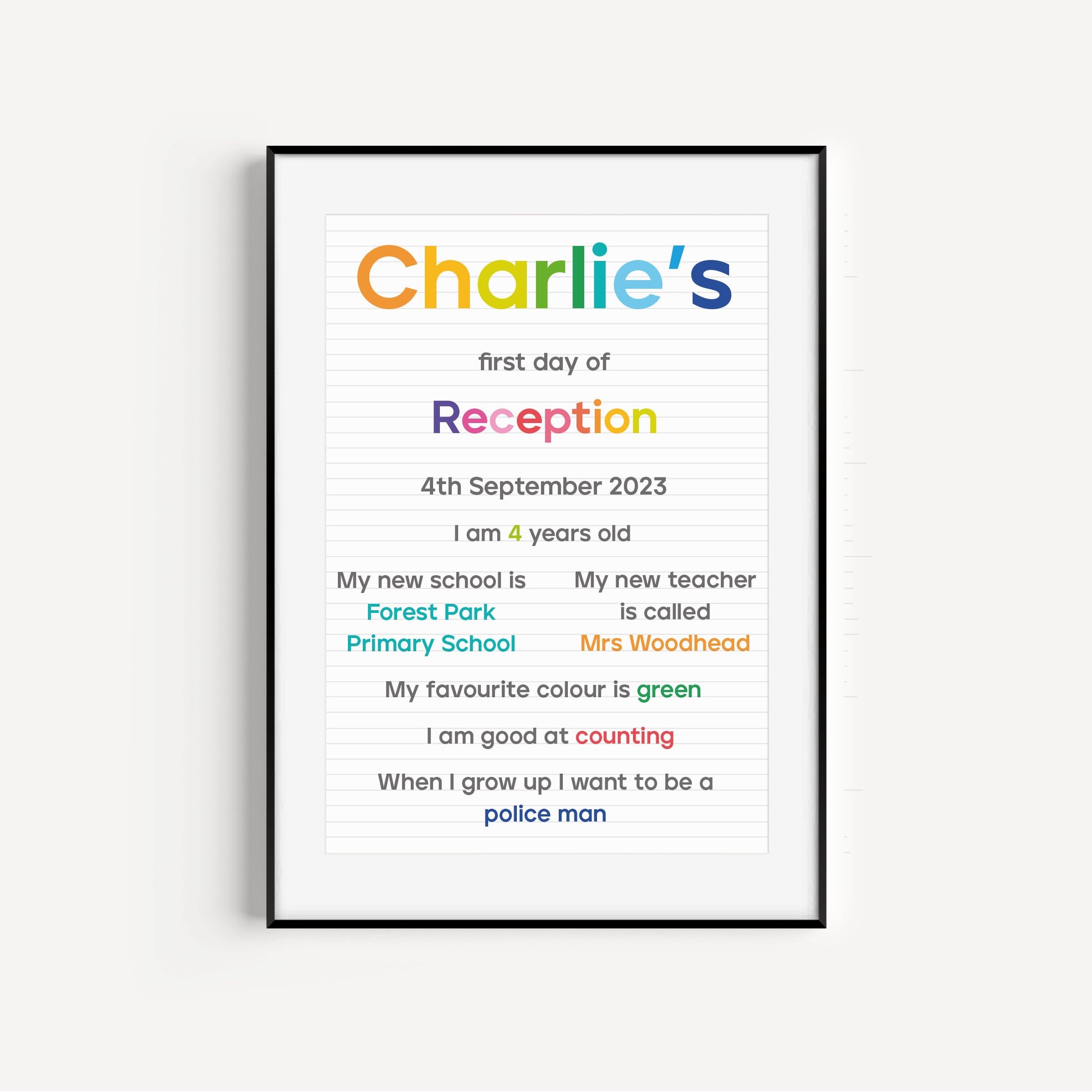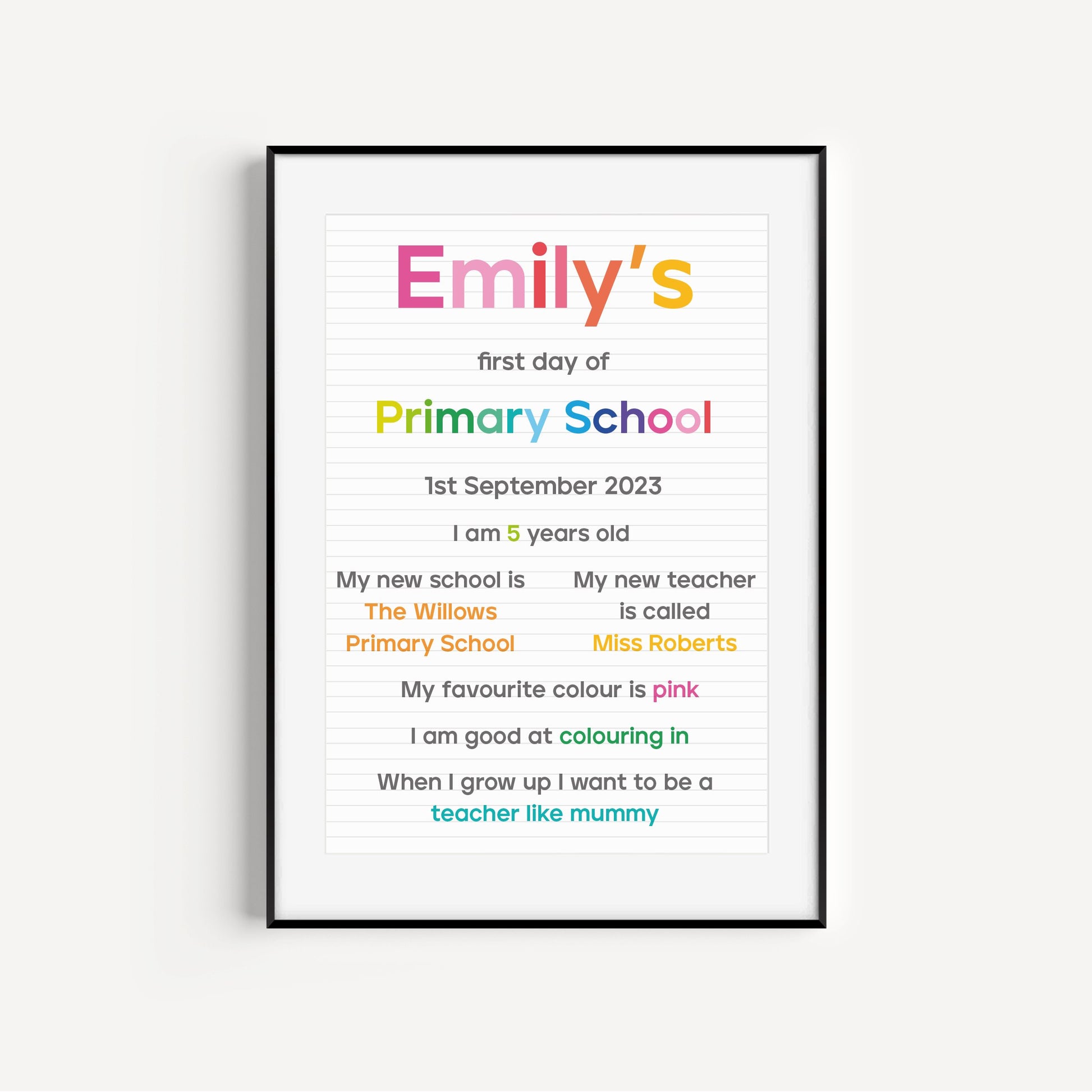 Celebrate their first day at school in style! This brightly coloured typographic print makes a perfect photo prop for their first day at school photo!